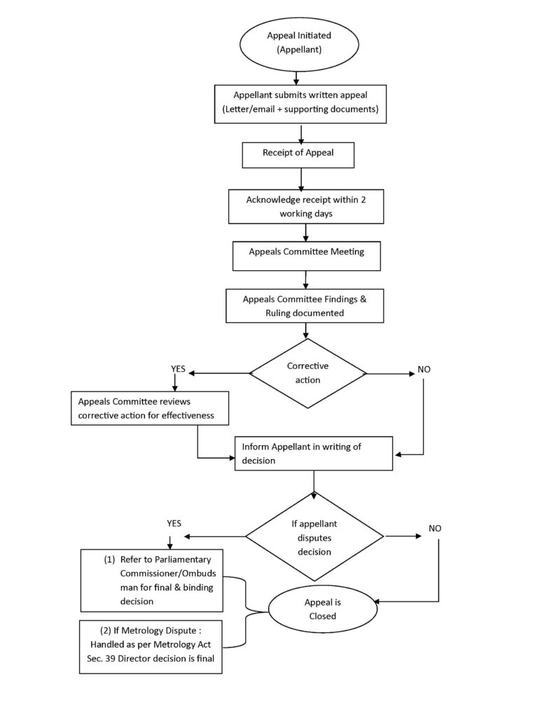 The flow chart outlines the procedure for handling appeals against processes and services of SLBS, detailing responsibilities, actions, and record-keeping requirements.