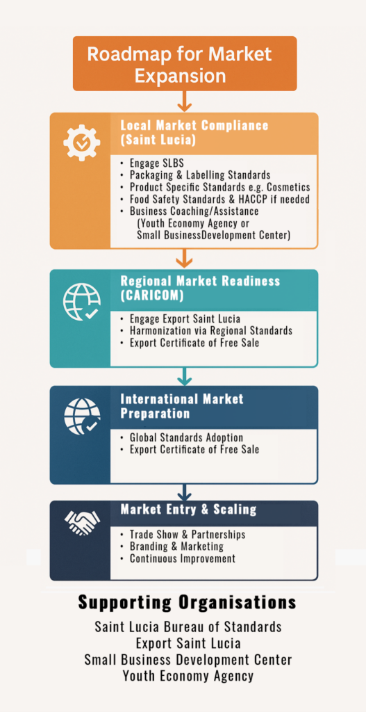 Standards provide small businesses with credibility, consistency, and compliance needed to expand into regional and international markets by levelling the playing field with a harmonized basis defining quality. Organisations like the Saint Lucia Bureau of Standards (SLBS) and the CARICOM Regional Organisation for Standards and Quality (CROSQ) play a central role in this process, especially in sectors like agro‑processing, cosmetics and even in service provision.