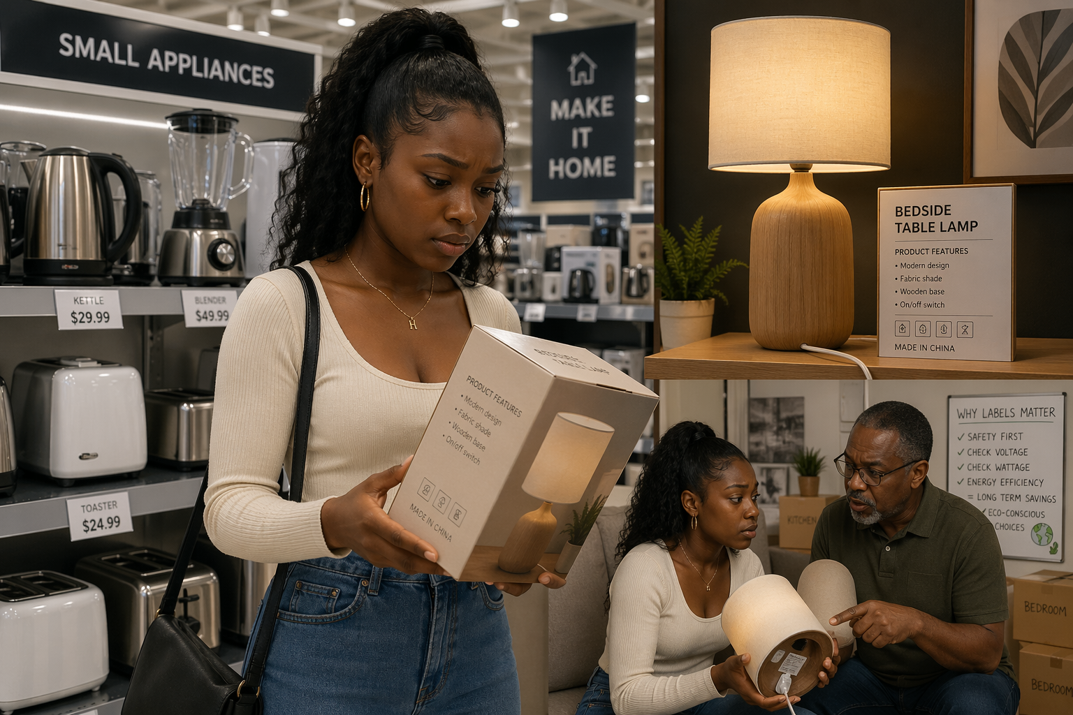 Hannah bought the lamp and brought it home where her father helped her move in and set up her appliances. Upon noticing the lamp and the lack of details listed on their labelling Hannahs father began to lecture her on the risk associated with purchasing unproperly labelled electrical appliances. Hannahs father also explained to her the importance of attempting to purchase appliances labelled specifically for energy efficiency or conservation. As a means of ensuring long term savings and making informed eco-conscious buying decisions.